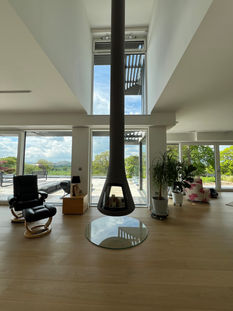 This highly sustainable three storey house is built into the hillside and has a swimming pool on the lowest level. It looks out onto huge views over the surrounding countryside and the brise soleil over the large triple glazed south facing windows help to reduce heat build up in the supper. Highly insulated and sunk into the hillside, with ground source heat pumps and photovoltaic panels it is an extremely low energy house.